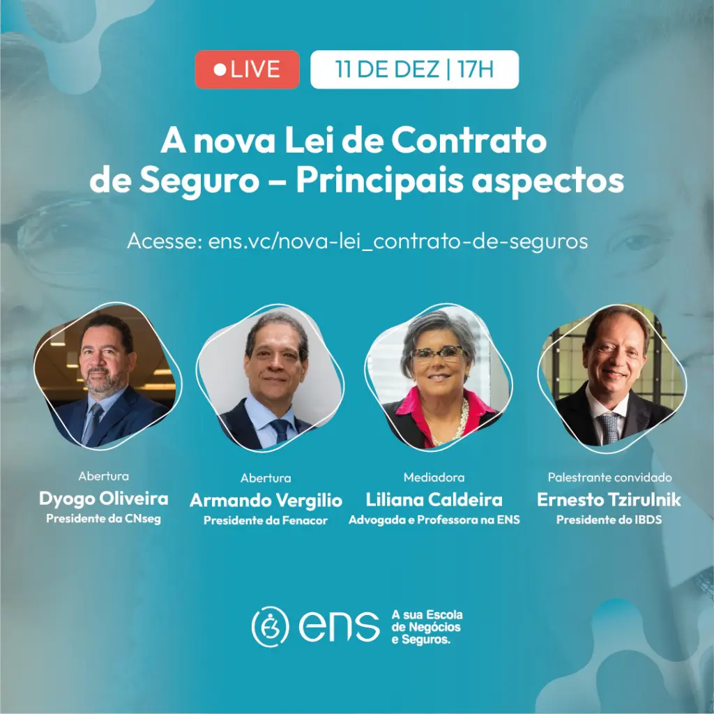 Ernesto Tzirulnik e convidados abordam os principais aspectos sobre a nova Lei do Contrato de Seguro em live para a ENS – Escola de Negócios e Seguros. Assista agora, ao vivo, através deste link.